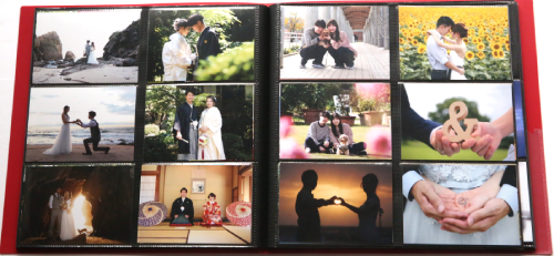 そこで弊社では納品させていただく写真(150~200枚以上)すべてをLサイズでプリントし、専用のフォトアルバムに入れてプレゼントしています。ウエディングアルバムに比べるとデザイン性はありませんが、写真が引き立つ台紙を使っていますのでスマホでご覧いただくより格段に見やすくなるかと思います。